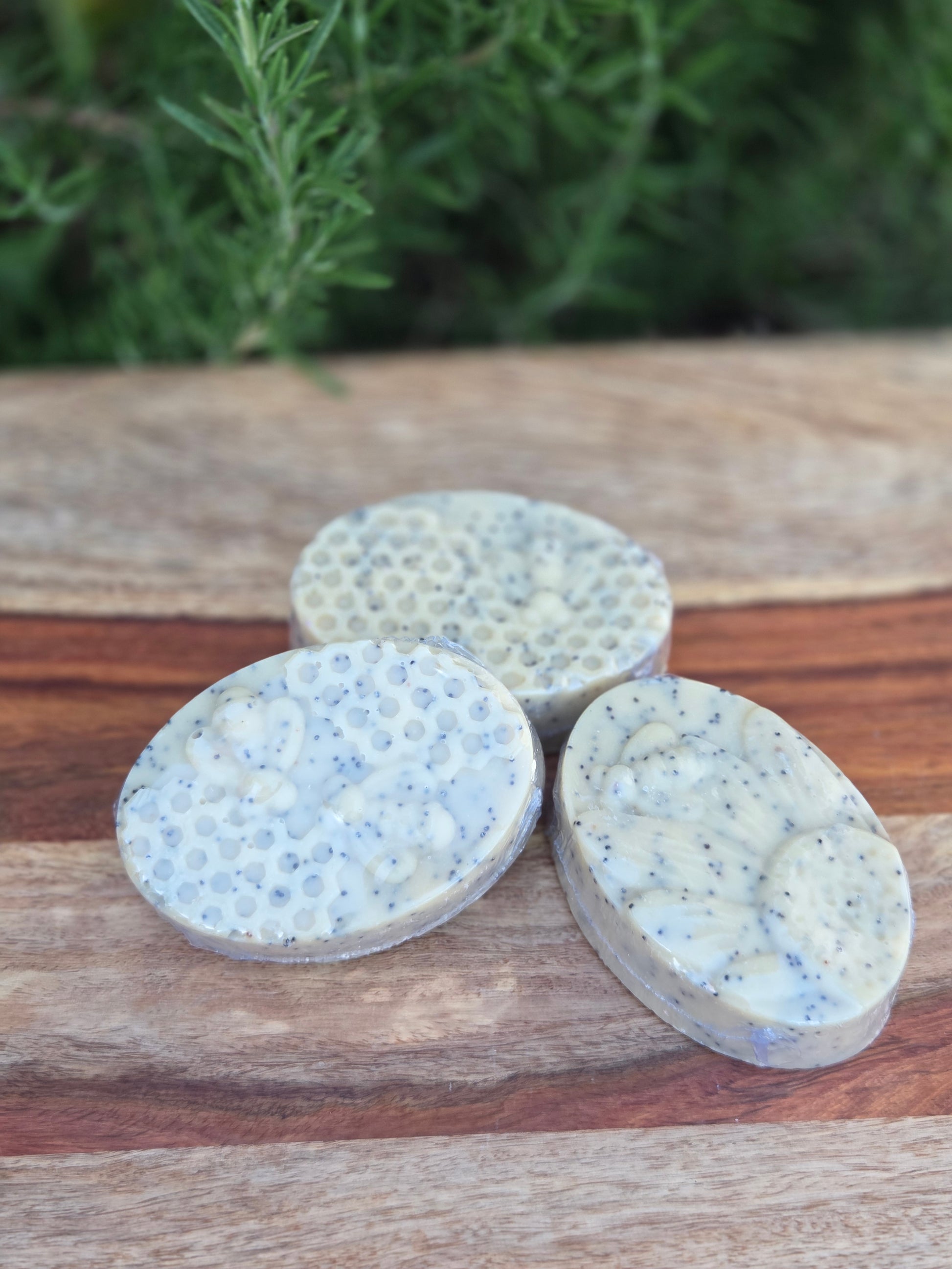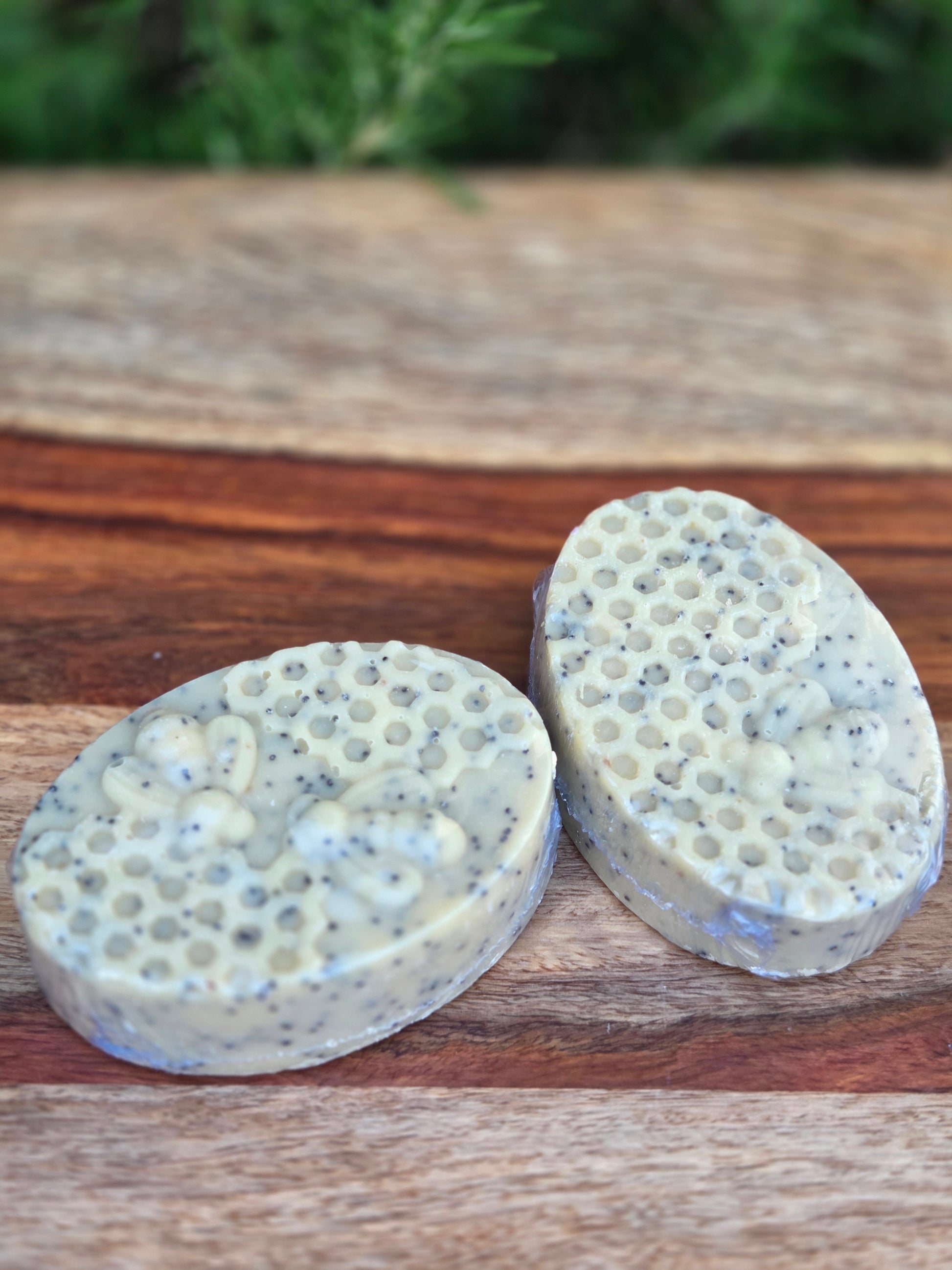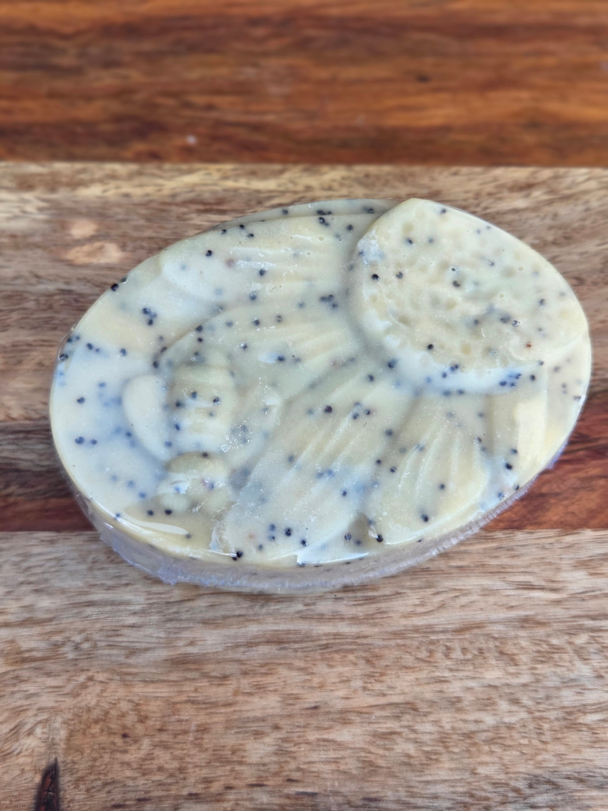 Ingredients: Olive Oil, Coconut oil, Shea Butter, Castor Oil, Beeswax, Lye, Distilled Water, Ground Pumice, Poppy Seeds, Essential Oils.