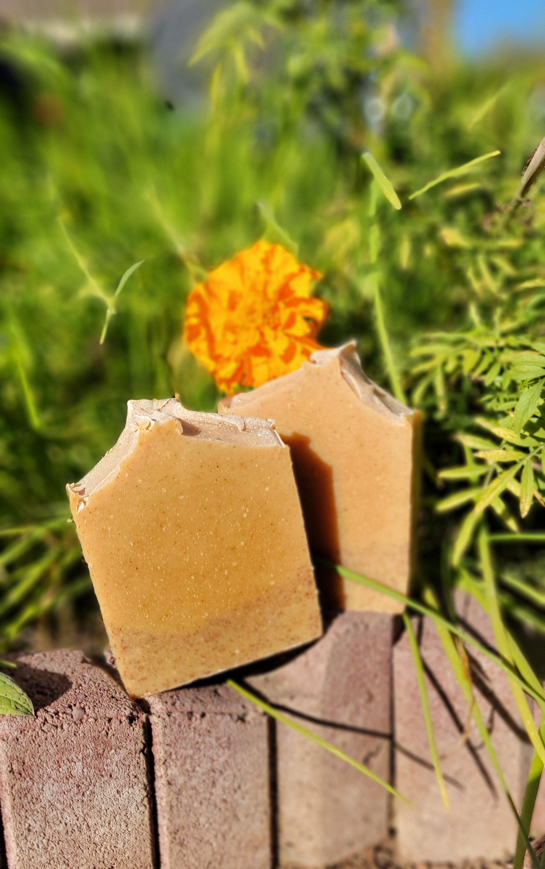 Ingredients: Palm Oil, Coconut Oil, Canola Oil, Olive Oil, Castor Oil, Lye, Coconut Milk, Colloidal Oatmeal, White Kaolin Clay, Sweet Almond Oil, Turmeric, Ground Walnut Shells